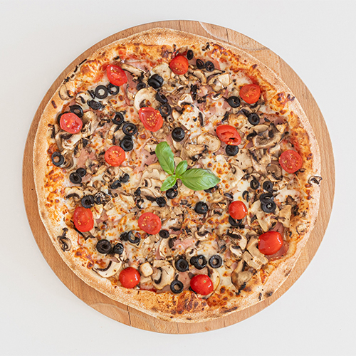 Szynka, pieczarki, pomidorki koktajlowe, oliwki czarne, mozzarella, sos pomidorowy, oregano