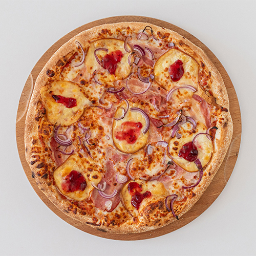 Mozzarella, sos pomidorowy, boczek, cebula, ser wędzony, żurawina, oregano