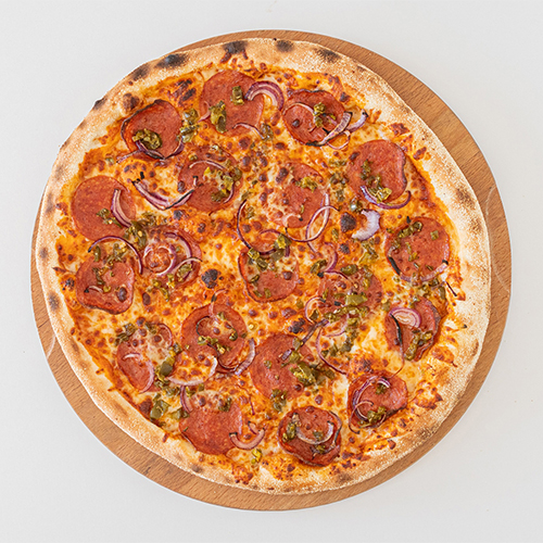 Salami pepperoni, jalapeno, czerwona cebula, mozzarella, oregano, sos pikantny