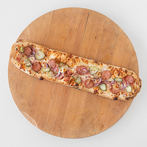 Boczek, kiełbasa, cebula, ogórek kiszony, czosnek, mozzarella